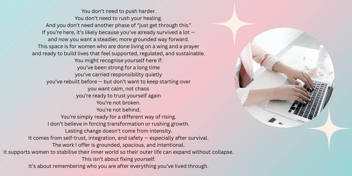 My work blends emotional intelligence, nervous system awareness, and grounded coaching to help women move forward without force, pressure or self-betrayal.